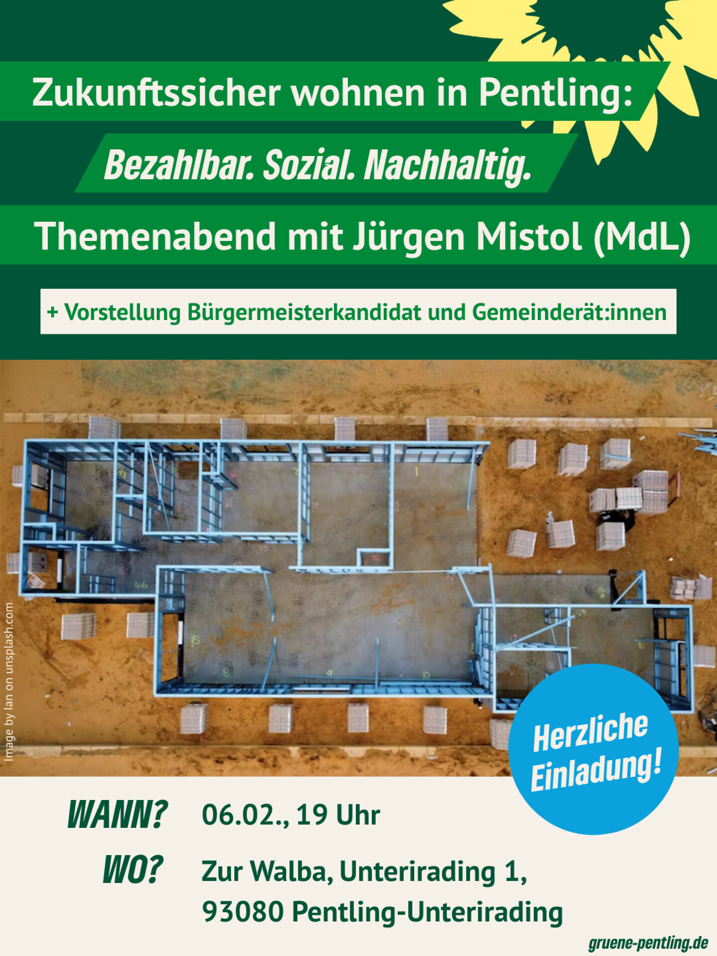 Gast des Abends ist Jürgen Mistol (MdL), wohnungspolitischer Sprecher der Grünen im Bayerischen Landtag. In seinem Vortrag geht es um aktuelle Herausforderungen in der Wohnraumpolitik sowie um Lösungsansätze für sozial gerechtes und nachhaltiges Bauen. Im Anschluss besteht Gelegenheit zur Diskussion und für Fragen aus dem Publikum.
