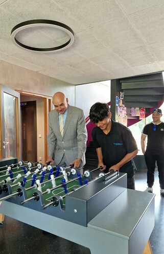 Zum Abschluss konnte sich Jürgen Mistol noch einen Eindruck von der Sporthalle des Jugendzentrums machen, indem er sich am Torwandwerfen versuchte und in vielen Partien Rundlauf an der Tischtennisplatte sein Können unter Beweis stellte.