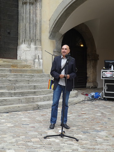 Als vierter Redner unterstrich Jürgen Mistol die Bedeutung der Regenboggenflagge als Zeichen für Toleranz und Akzeptanz. Er zeigte sich auβerdem zufrieden mit dem Plan der EU-Kommission, ein Vertragsverletzungsverfahren gegen die queerfeindlichen Gesetze Ungarns und Polens anzustrengen. Aber nicht nur in der EU gebe es viel zu tun. “Es wartet noch ausreichende Arbeit vor unserer eigenen Haustür”, so Mistol. “Wir brauchen ein diskriminierungsfreies Gesundheitssystem. Und, wir müssen vor allem zusehen, dass die Würde eines jeden Menschens gewährleistet ist.” Dafür sind “wir Grüne bereit, weil ihr es seid”, beendete Mistol seine Rede.