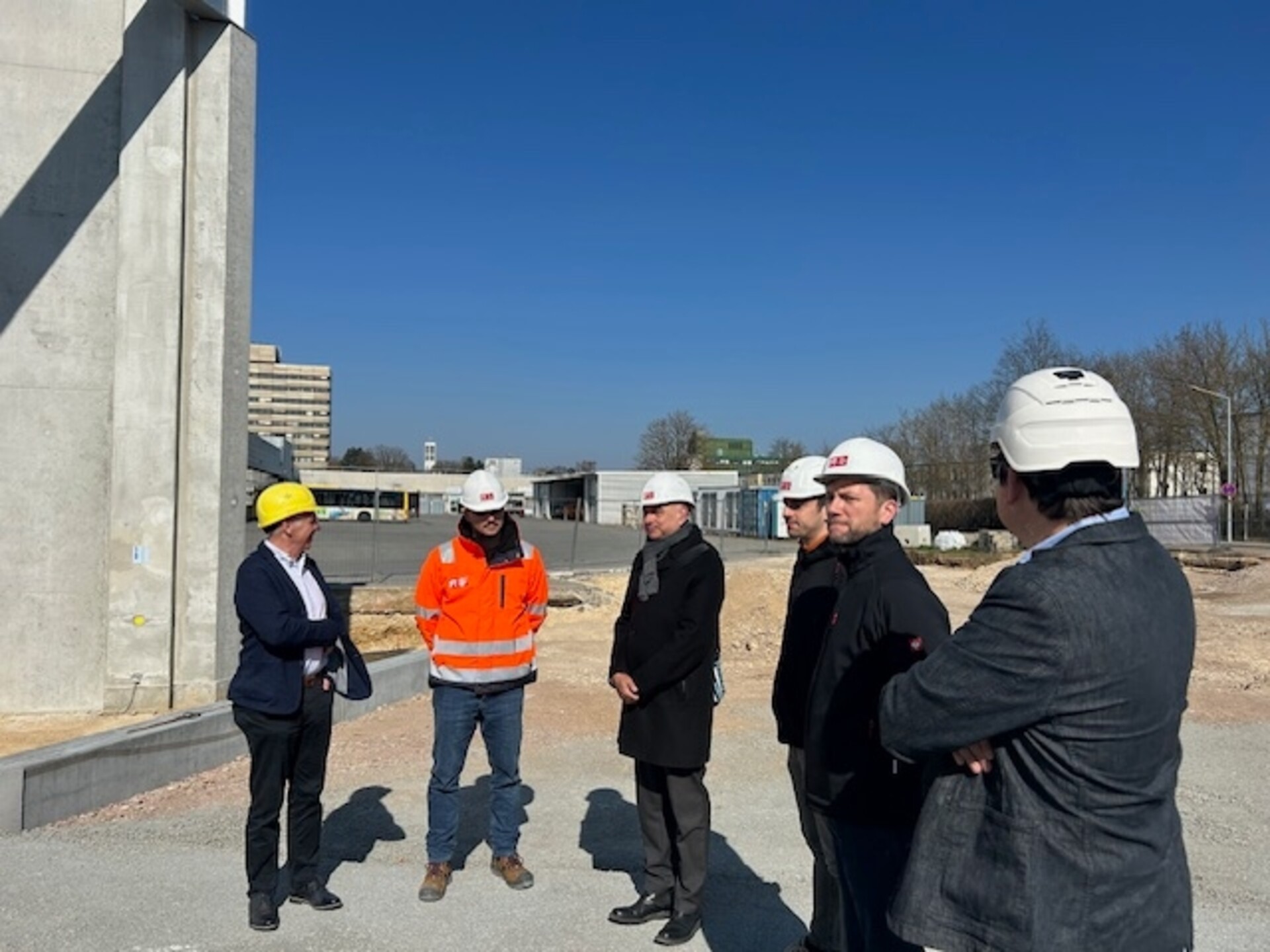 Am Vormittag besuchten Andreas Birzele und Jürgen Mistol gemeinsam mit Geschäftsführer Michael Thon und Gesellschafter Ewald Weber der Firma Tausendpfund eine Baustelle auf dem Gelände von das Stadtwerk Regensburg. Dort entsteht eine moderne Ladeinsel für 50 Elektrobusse in Form einer überdachten Abstellanlage mitsamt Ladestruktur. Im anschließenden Austausch in der Firmenzentrale ging es um die Herausforderungen der Baubranche – von Bürokratie über Fachkräfte bis hin zu praxisgerechter Bürokratie.