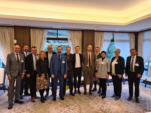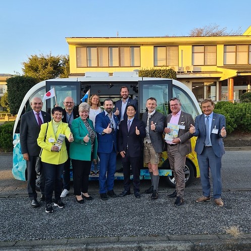 Zunächst ging es zum „National Institut of Advanced Industrial Science an Technology“ (AIST), einer der größten Forschungsorganisationen Japans. Mittels sieben Forschungsbereichen arbeitet man dort an Initiativen zum Aufbau einer nachhaltigen Gesellschaft. Dazu gehören „Grüne Technologien“ wie beispielsweise „Urban Mining“, die dicht besiedelte Städte als Rohstofflager der Zukunft begreift, in der identifizierte Wertstoffe aufbereitet und wiedergewonnen werden. In der Präfektur Ibaraki hat sich Delegation mit Vertretern der Verwaltung über das Thema „Landflucht“ ausgetauscht, das auch in Japan in vielen Regionen eine wachsende Herausforderung darstellt. Damit auch in schrumpfenden Regionen Mobilität insbesondere für ältere Menschen gewährleistet wird, sind in der 24.000 Einwohnerstadt Sakai seit 2020 dauerhaft drei autonom tfahrende Busse im Einsatz, die im vielbefahrenen Straßennetz mit einer Höchstgeschwindigkeit von 20 km/h unterwegs sind.