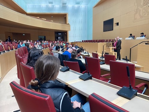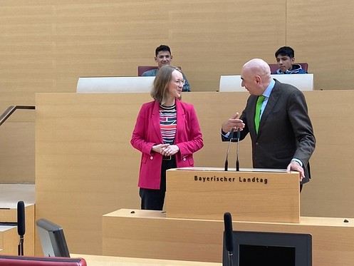Thematisch ging die Diskussion im Plenarsaal in viele Richtungen. Ein Schwerpunkt war Energiepolitik und -wirtschaft, besonders die Abschaltung der letzten deutschen AKWs. Weiterhin standen die erneuerbaren Energien und die Energiegewinnung durch die PV-Anlagen im Mittelpunkt. Die Jugendlichen aus Regensburg fragten sowohl nach Studienbedingungen von Auszubildenden und nach bezahlbarem Wohnraum, nicht nur für sie. Diesen zu gewährleisten sei eine „Pflicht“, so Jürgen Mistol. Auch weitere soziale Themen kamen zur Sprache - der Feminismus und die gerechte Verteilung der Macht zwischen den Geschlechtern, sowie die Frage, wie man eine gegenseitiges Vorurteilsbewusstsein schaffen kann und von Gender unabhängig auf Augenhöhe und mit Respekt füreinander auftreten kann. In der Diskussion wurden auch konkrete Fragen zur Arbeit des Landtags gestellt. Die Besucher*innen fragten, wie die Sitzverteilung auf den Stühlen, wo sie selbst sitzen durften, ist. Die beiden Abgeordneten wurden auch befragt, wie sie zu der Regierung von Markus Söder stehen und welche Konsequenzen seine mangelhafte Anwesenheit an Sitzungstagen hat bzw. haben soll.
