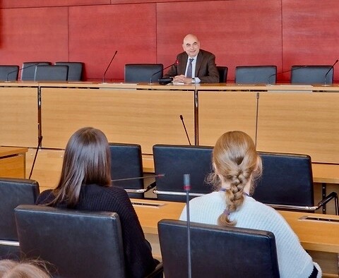 Den Beginn markierte jedoch eine eigene Diskussionsrunde im Konferenzsaal, bei der sich Jürgen Mistol den Fragen der wissbegierigen und auch selbstkritischen Schülerinnen und Schüler stellte. So debattierte eine Teilnehmerin mit dem Abgeordneten, ob die Herabsenkung des Wahlalters in Bayern auf 16 Jahre angesichts des starken Konsums sozialer Medien durch Jugendliche überhaupt sinnvoll sei. Jürgen Mistol stellte sich dabei ganz klar hinter diese Forderung seiner Fraktion: Jede Generation sei auf irgendeinem Weg beeinflussbar. „Wichtig ist, dass wir die Informationsflut managen und es allen Leuten ermöglichen, Fakten gegenzuprüfen. Das steht erstmal unabhängig davon, dass wir junge Menschen nicht nur anhören, sondern ihnen auch aktive Gelegenheiten zur Partizipation einräumen!“