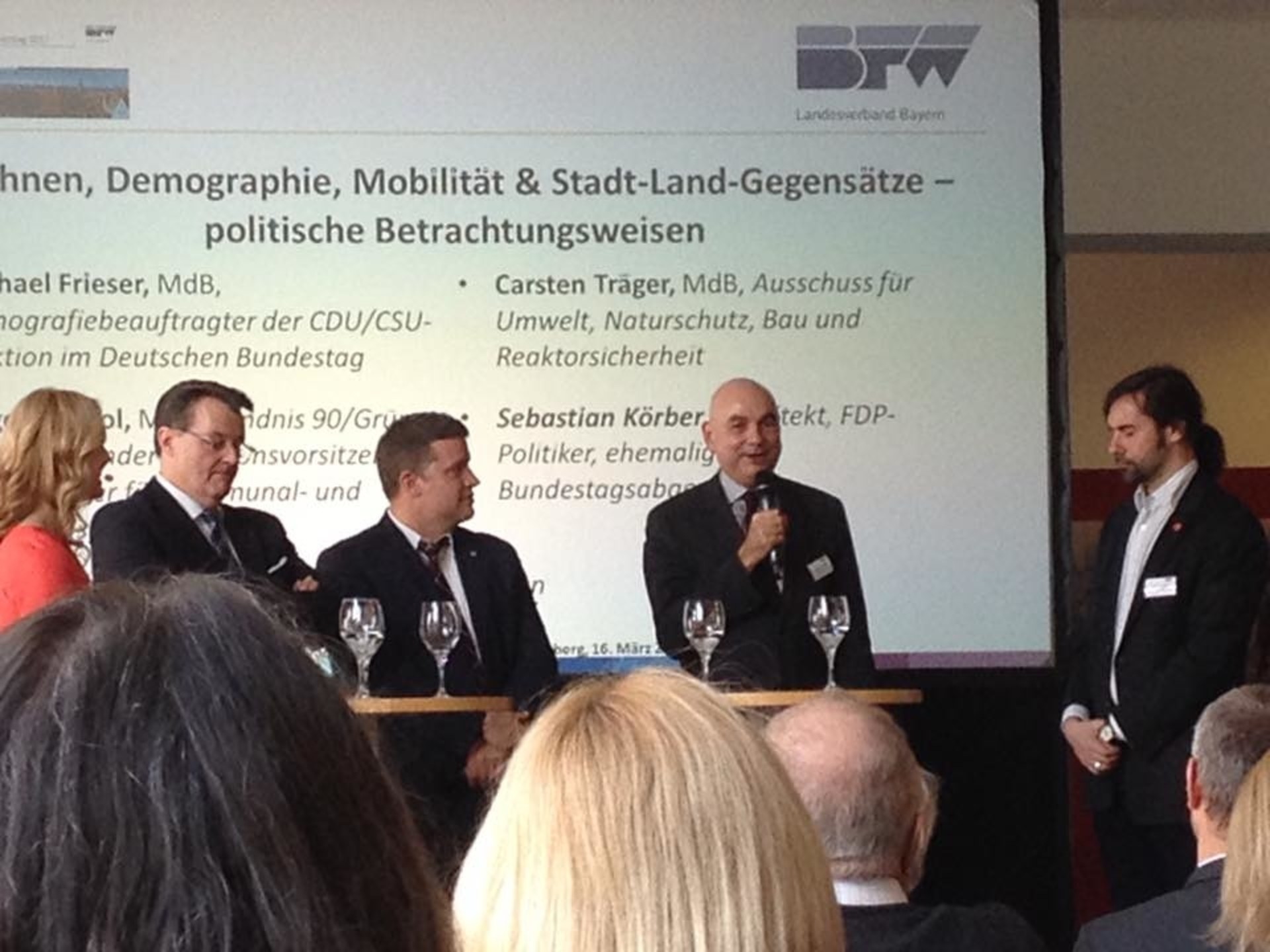 Jürgen Mistol diskutierte mit Michael Frieser (MdB, CSU), Carsten Träger (MdB, SPD) und Sebastian Körber (FDP) auf dem Bayerischen Immobilientag 2017 in Nürnberg über politische Stellschrauben, die es in Bezug auf Wohnen, Mobilität und Demografie zu drehen gilt.