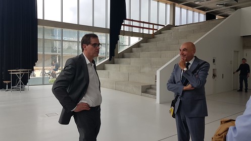 Als möglichst ökologisches Gebäude konzipiert sei auch das Design der Innenräume so angelegt, dass sich offene Lehr- und Lernräume über mehrere Stockwerke hinweg ziehen, sodass dank der Akustik der Teilgebäude sowie dem Weglassen visueller Trennungen auch mehrere Veranstaltungen nebeneinander und gleichzeitig ohne gegenseitige Lärmbeeinträchtigung stattfinden können und so ein studentisches und personelles Miteinander entstehe. Wurde dieser Bau verhältnismäßig schnell abgeschlossen, seien grundsätzlich aber die Zeitschienen problematisch, da staatliche Bauprozesse selbst bei privatem Sponsoring meist mehr als 10 Jahre in Anspruch nähmen, während der Hochbau in der Privatwirtschaft innerhalb weniger Jahre fertig sei.
