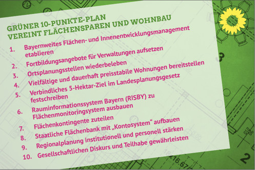Der gestiegene Bedarf an Wohnraum und die notwendige Reduktion des Flächenfraßes erscheint auf den ersten Blick als unlösbares Dilemma. Für uns Grüne aber sind sie zwei Seiten derselben Medaille. Deshalb haben wir eine Studie mit dem Titel „Flächensparen und Wohnraumversorgung“ in Auftrag gegeben, die Prof. Dr. Manfred Miosga auf unserer Pressekonferenz vorgestellt hat. Der Grüne 10-Punkte-Plan wird dann konkret aufzeigen, wie der Freistaat Bayern die Vorgabe, nur fünf Hektar Fläche am Tag zu verbrauchen, mit dem Ziel, ausreichend Wohnraum zu schaffen, vereinen kann.