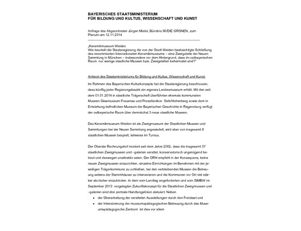Zur Antwort auf seine Anfrage an die Bayerische Staatsregierung erklärt Jürgen Mistol: "Das Internationale Keramikmuseum in Weiden hat auch in München einen hervorragenden Ruf. Eine Schließung durch die Stadt Weiden würde ein Vorzeigeprojekt und die gute Arbeit vieler Jahre beenden. Ich kann die Verantwortlichen der Stadt nur ermuntern, zusammen mit dem Freistaat nach Lösungen für den Erhalt des Museums zu suchen. Aber auch die Staatsregierung, die Kommunen wie die Stadt Weiden in die finanzielle Lage versetzen muss, kulturelle Infrastruktur erhalten und fortentwickeln zu können, sehe ich in der Pflicht."