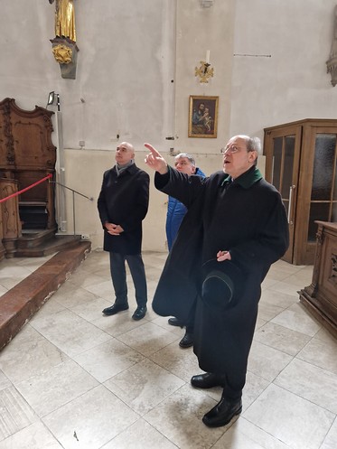 Im Anschluss an das Gespräch führte Johannes Hofmann die beiden Abgeordneten durch die Räume der Kirche und verdeutlichte an vielen Stellen die Sanierungsbedürftigkeit des Gebäudes. Anhand der ausführlichen Begehung von Sakristei, Altar, Kapelle und Gruft sowie der anschaulichen Schilderung der Pläne durch den Stiftsdekan konnten sich die beiden Abgeordneten ein gutes Bild machen, wie die neue Kirche auch am Inneren erneuert werden soll.