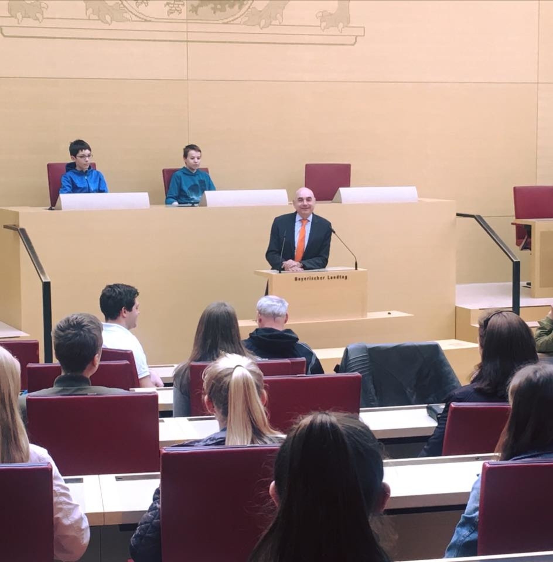 Im Plenarsaal durften die Jugendlichen auf den Sitzen, die eigentlich den Abgeordneten des bayerischen Landtags vorbehalten sind, Platz nehmen. In dieser Kulisse stellten die Besucherinnen und Besucher viele Fragen zur parlamentarischen Arbeit: Wie lange dauert es ein Gesetz zu verabschieden? Wie gut sind Plenarsitzungen besucht? Was machen die Abgeordneten, wenn sie nicht im Plenum sind?