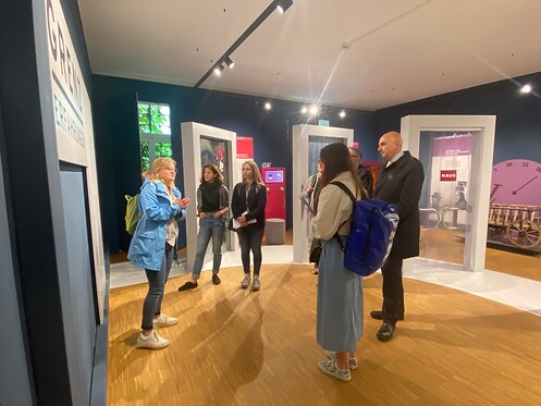 Vor dem Stammtisch stand ein Museumsbesuch im Landestormuseum im Furth im Wald auf dem Programm. Neben dem „alten Drachen“, der raumgroßen Statue, die jahrelang den bekannten Drachenstich begleitet hat, ist hier die Ausstellung „Grenzerfahrungen“ zu sehen. Sie ist ein grenzüberschreitendes Projekt, Ergebnis der Zusammenarbeit mit der Partnerstadt Domažlice. Anschaulich sieht man hier, wie die Grenzregion sich seit der Zeit der Hussiten-Überfälle über die Vertreibung der deutschsprachigen Bevölkerung und den Eisernen Vorhang bis in die Gegenwart entwickelt hat. Vom Turm des Further Schlosses kann man dann die Grenze gut beobachten.