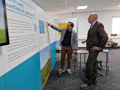 Auf Einladung von Dr. Andreas Schieder von TenneT besuchte Jürgen Mistol das neue Erdkabelinformationszentrum in Wörth an der Donau. Seit Juli in Betrieb dient die über ein gesamtes Stockwerk reichende Ausstellung als Informationsort über das Projekt SüdOstLink sowie als Begegnungsort für dessen Beteiligte und Kritiker*innen. Während einer Tour durch das EKIZ erläuterte Andreas Schieder den Aufbau der Kabel, den Verlauf der Trassen für den SüdOstLink und die damit einhergehenden Herausforderungen sowie den Gesprächsprozess mit Flächeneigentümer*innen. Da pro Bauabschnitt bis zu 1,6km Kabel in beide Richtungen verlegt werden würden, müsse außerdem der Transport der schweren Kabeltrommeln logistisch bewerkstelligt werden.