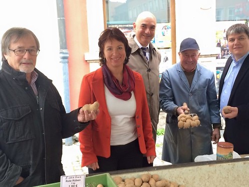 Mit dem Rundgang über den Weidner Bauermarkt startete der nächste Tag, Gespräche mit den regionalen Erzeugern standen auf dem Programm. Der Rundgang wurde ein richtiges Erntedank-Fest: Das üppiges Angebot an ökologischen und regionalen Produkten auf dem Unteren Markt in Weiden überzeugte. Das war 'Heimat. Genuss. Kultur', wie die Grüne sich das vorstellen. Mit dabei war auch Veit Wagner, grüner Stadtrat in Weiden, der natürlich stolz seinen Weidner Markt präsentierte