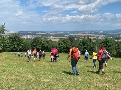Nach dem Start in Česká Kubice wanderte die Gruppe nach Babylon. Nach einer Picknickpause ging es weiter in Richtung Domažlice mit wunderschönen Aussichten auf die umliegende Landschaft. Am Nachmittag kam die Gruppe in Domažlice an. Dort hatten alle Teilnehmer*innen die Möglichkeit, an einer Führung durch die Ausstellung „Achtung, Grenze!” von Frau Pinkrová teilzunehmen, die auch in Furth im Wald zu sehen war. Die Ausstellung bot weitere Einblicke in die Geschichte der Region und die Bedeutung des heutigen interkulturellen Austauschs und der grenzüberschreitenden Zusammenarbeit, um die Fehler der Vergangenheit nicht zu wiederholen.
