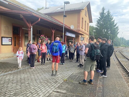 Zum elften Mal lud Jürgen Mistol Parteifreund*innen aus den Kreisverbänden der deutschen und tschechischen Grünen sowie regionale Akteur*innen der bayerisch-tschechischen Zusammenarbeit und weitere Interessierten aus den Gesellschaften beider Länder zu einer grenzüberschreitenden Wanderung ein. Dieses Jahr war etwas anders als bei den Vorherigen, denn die Teilnehmer*innen überquerten die bayerisch-tschechische Grenze mit dem Zug. Die Grenze, über die die Wanderung führen sollte, war die zwischen der Region Hindle (dem Chodenland) und Böhmen, vor 80 Jahren die historische Grenze zwischen dem Sudetenland und Protektorat Böhmen und Mähren. Kurz nach 9 Uhr versammelten sich alle Teilnehmenden in Česká Kubice, um die Wanderung zu beginnen.