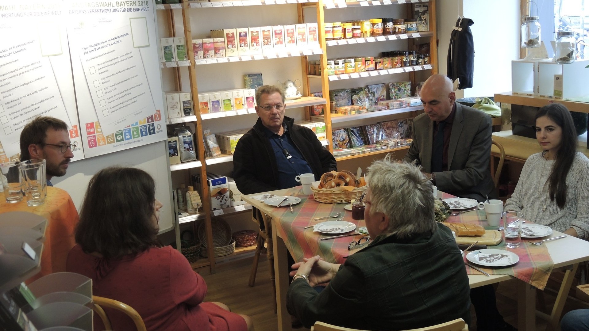 Jürgen Mistol besucht gemeinsam mit den anderen Landtagskandidat*innen Benedikt Suttner (ÖDP), Richard Spieß (Linke), Margit Wild (SPD), sowie Bezirkstagskandidatin Maria Simon (Grüne) den Eine Welt Laden in der Oberen Bachgasse, um gemeinsam mit Sabine Leistner über eine bessere Umsetzung des fairen Handels zu diskutieren.